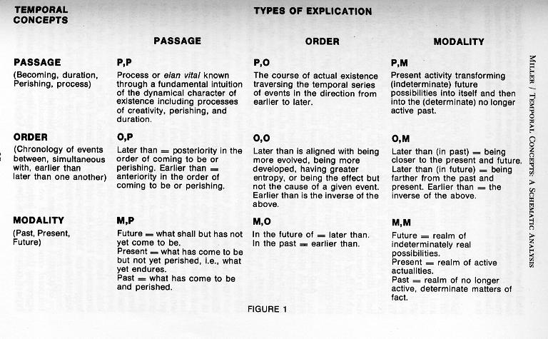 5. In distinguishing while holding together variant temporal concepts, the scheme can provoke attempts to explain the relations diagrammed. Are some of the concepts more basic than others, and if so, in what ways? Can some be reduced or eliminated in a more adequate account, and if so, how? Are there ways to synthesize the several concepts into a comprehensive metaphysics of time which can interpret the real status of whatever is characterized by each of the descriptions? Some of the relational explications describe ways in which reductionist attempts have proceeded or might proceed, as for example in cell (M,O) where the modalities are assimilated to concepts of temporal order. However such an attempt at reduction will fail unless it also deals successfully with the remaining concepts of modality, (M,P) and (M,M), by showing either that they too can likewise be reduced or that they fail to signify features of reality or experience.